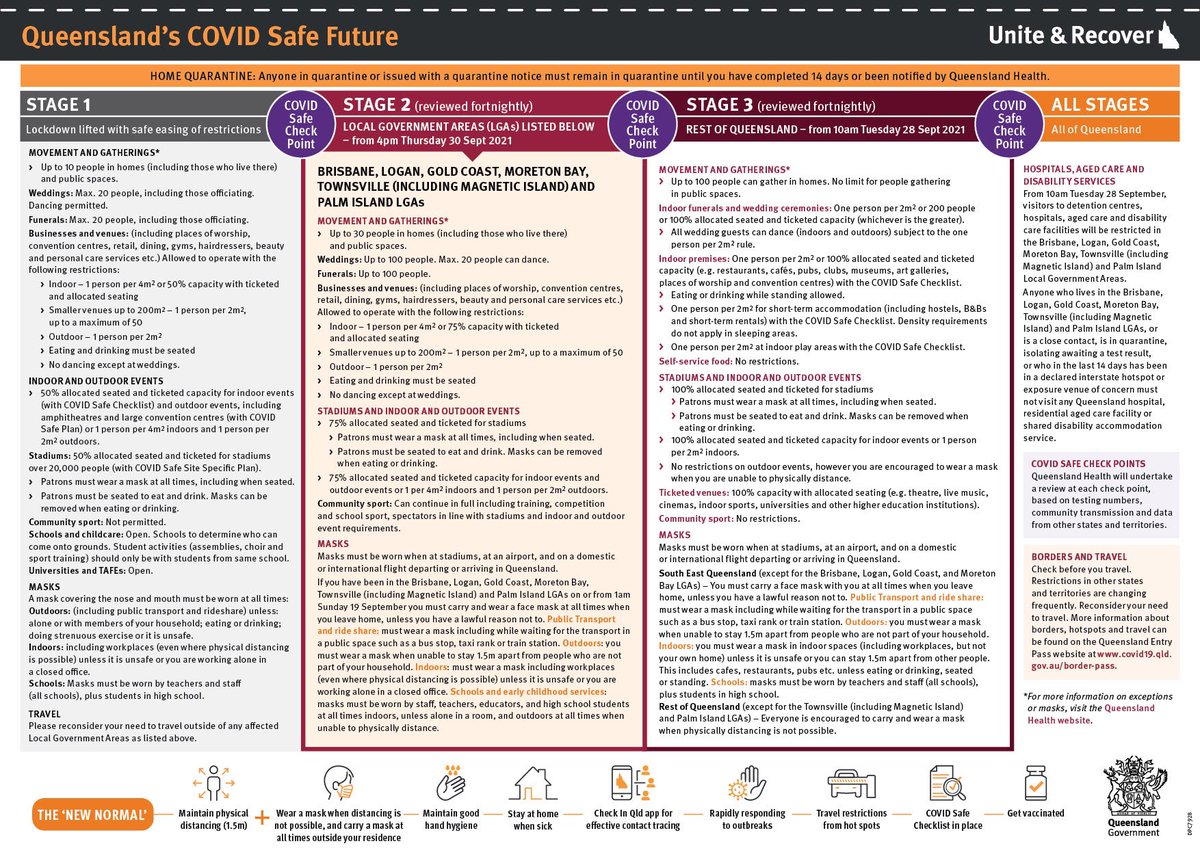 QUEENSLAND has released a new roadmap showing exactly how and when the state will emerge from its COVID-19 restrictions including a possible border re. Public Health Directions have been issued to help keep everyone in the community COVID safe. From 4pm Thursday 30 September 2021 the Local Government Areas of Brisbane Logan Gold Coast Moreton Bay Townsville including Magnetic Island and Palm Island will be in Stage 2 restrictions.